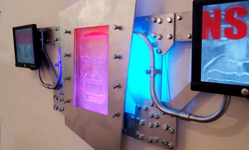 Machines were designed and built to function as kind of inter dimensional televisions providing a window to allow a clear signal that is trying to come through but encounters resistance, for various reasons, to reach us. CAD designed and constructed by artist Roland Ruocco using metal, board, original cast resin pieces, LED's, and computers. Machines speak about the worldwide rise of big data, A.I. and Robot technologies and their profound impact on people that use them everyday.